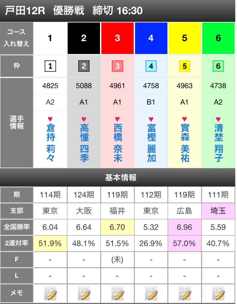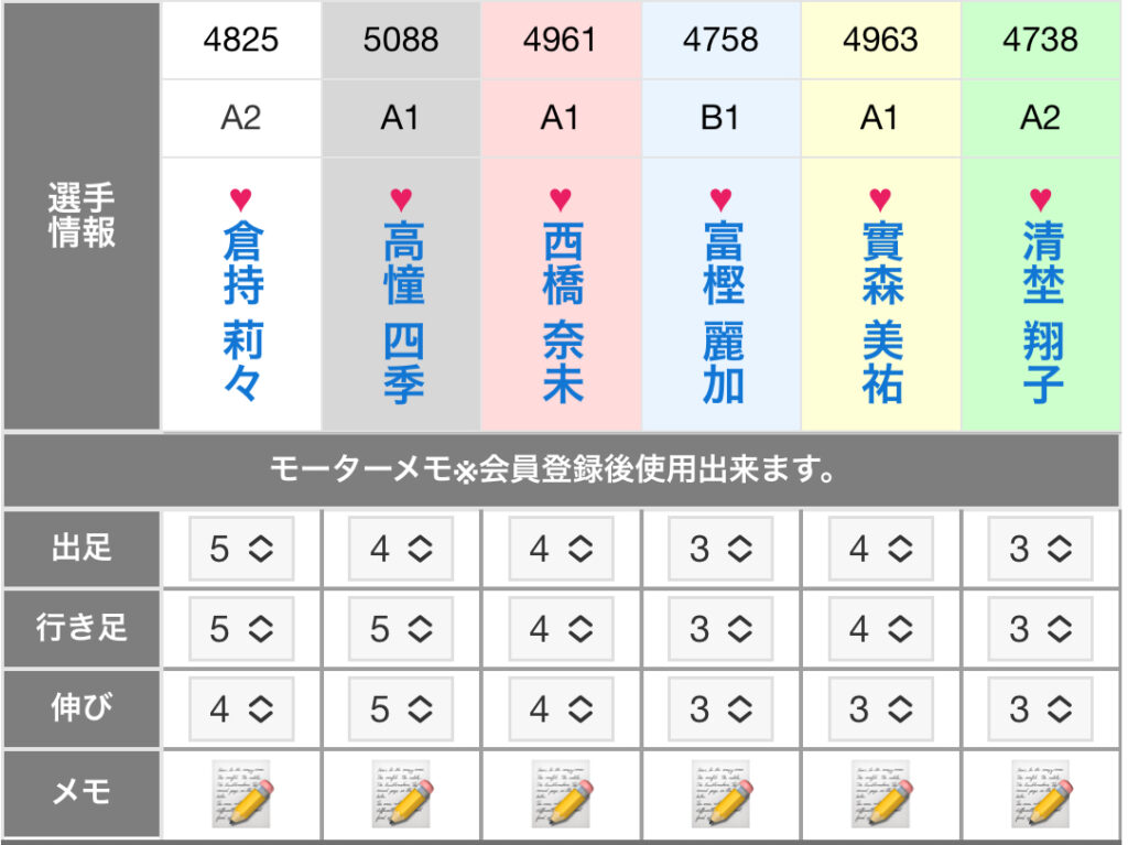 特に抜群なのがスロー3艇。その中でも①倉持選手②高憧選手の2人が1つ上にいるくらい抜群です。