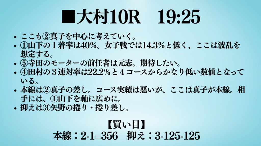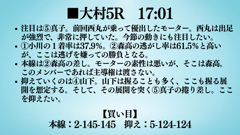 なぜ大村かと言いますと、前回の西丸選手のモーターを注目したいからです。