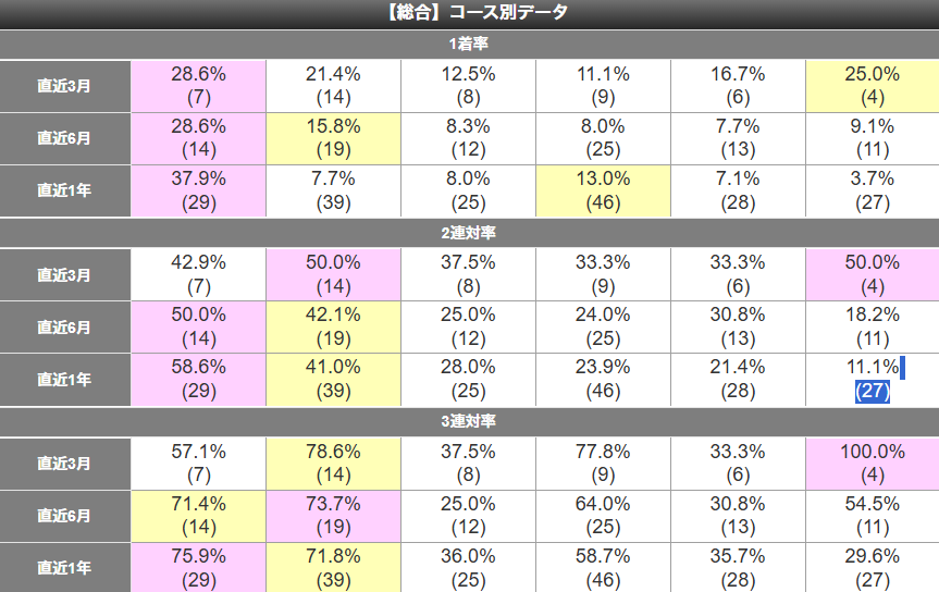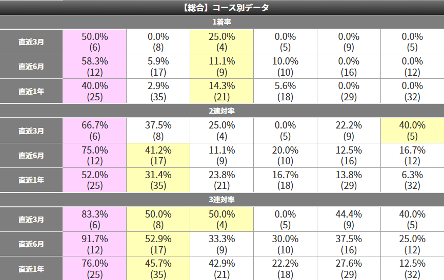 ④田村のコース実績は悪く、3連対率は22.2%という低い数値だ。