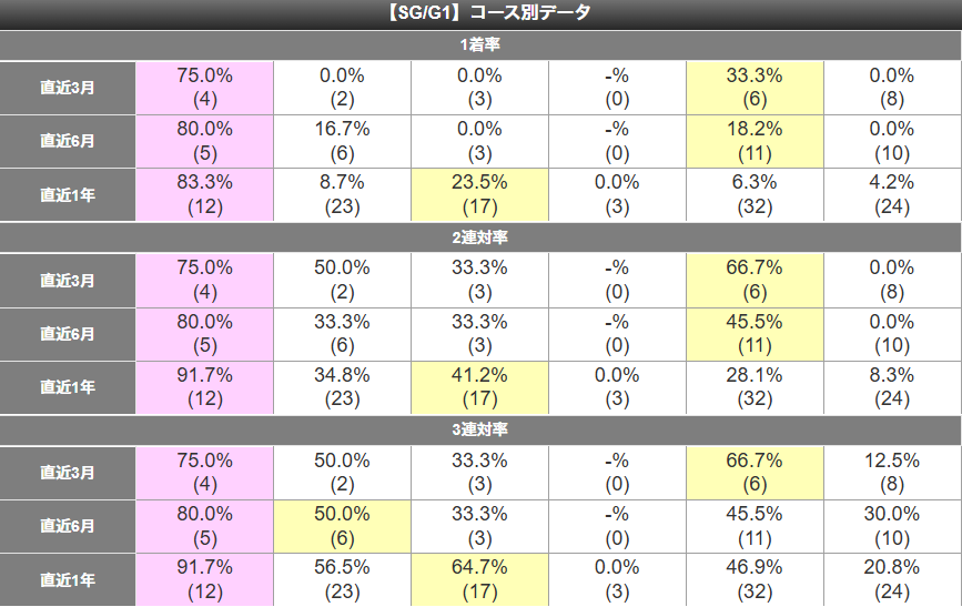 しかし、①金子のSG/G1戦での1着率は40%と低い。