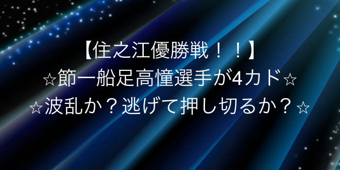 ①関野選手がスタート決めて先マイから押し切る。出足も良くなっていて1号艇向きの船足。スタート集中。②小池選手の船足は普通。③清埜選手はかなり良くなっている。出足・行き足UP。スタートも見えていてツケマイに攻める。④高憧選手の船足は節一。ここは伸びに全フリ。一撃捲りしか勝機はなさそう。⑤鎌倉選手⑥原田選手2人の船足は同じくらい。④高憧選手の攻めから展開待ち。単独で攻めきれるような足ではない。