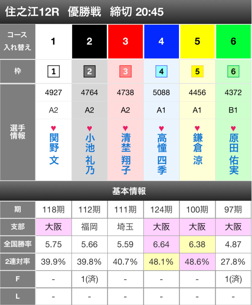 やはり注目は④高憧選手。水温も下がるはず。伸び足を上げる調整をして一撃。ピット離れを捨ててでも一択調整。仮にピット離れが少し遅れても枠なりを想定。⑤鎌倉選手は自力で勝負出来る足もない。④高憧選手が攻めてくれた方が展開は向く。しかし③清埜選手の行き足も良く半艇身以上は前にでないとキツイ。それでも強引に行くか、引いて捲り差しに構えるか。勝つには捲りきりしかない。ひけば3.4でやり合ってる間に①関野選手が逃げ切りそう。