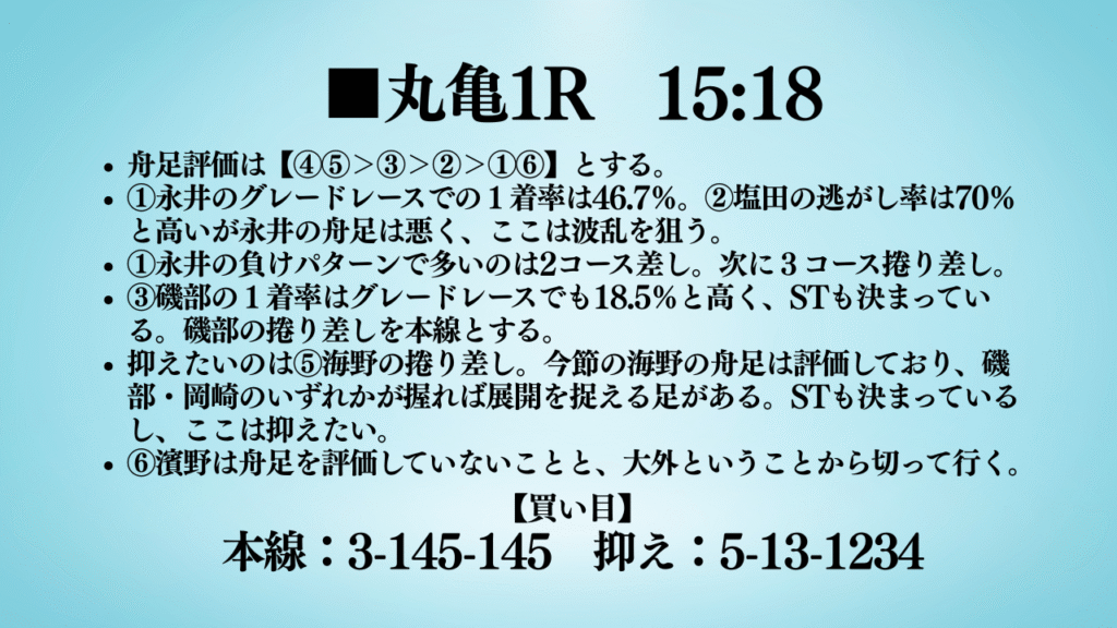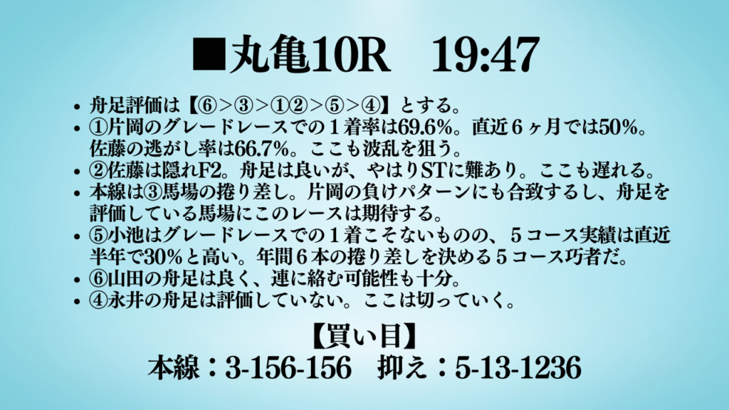 今回は丸亀G1四日目から2本、勝負レースを選定しました。