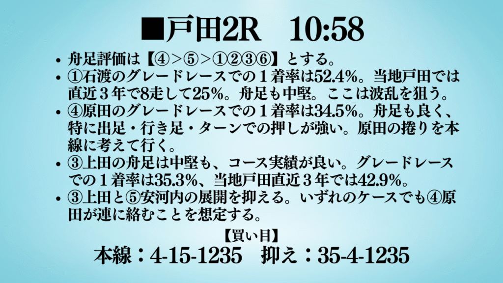戸田5R 4-1-3 44.8倍の中穴的中となりました。