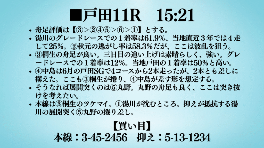 ①湯川の舟足は評価して低い。桐生のツケマイに沈むことを考えたい。