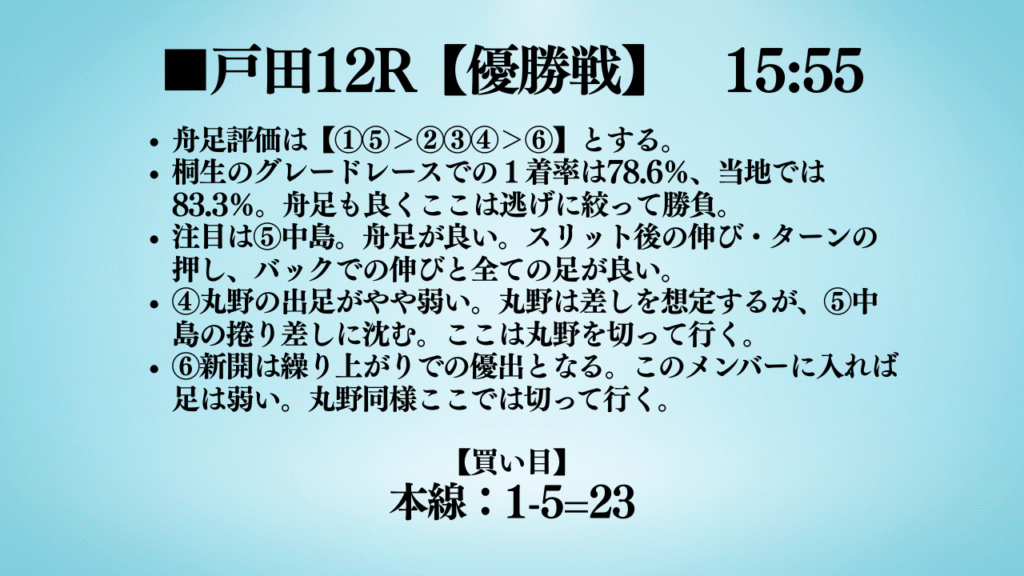 桐生の舟足は万全だし、優勝戦でしっかりとST決めるでしょう。