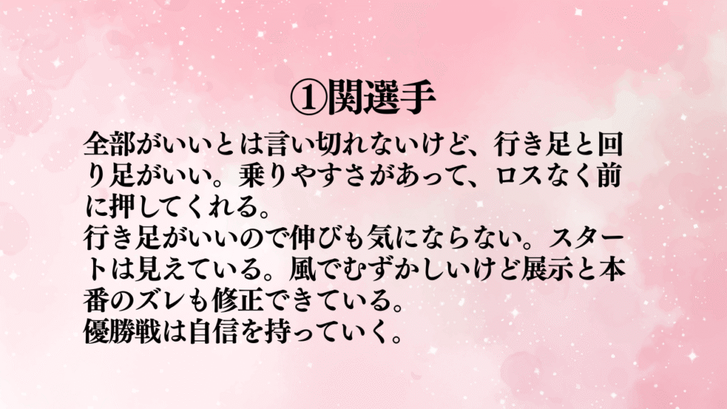 初日以降注目してきた関、馬場の二人が優出しましたね。