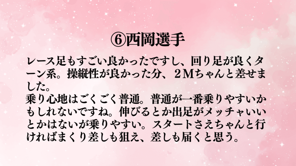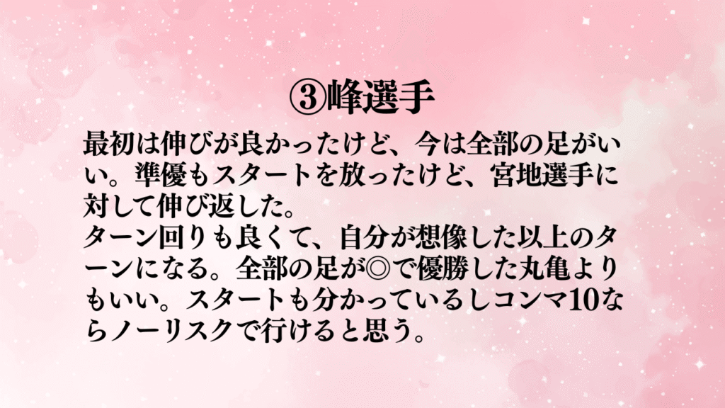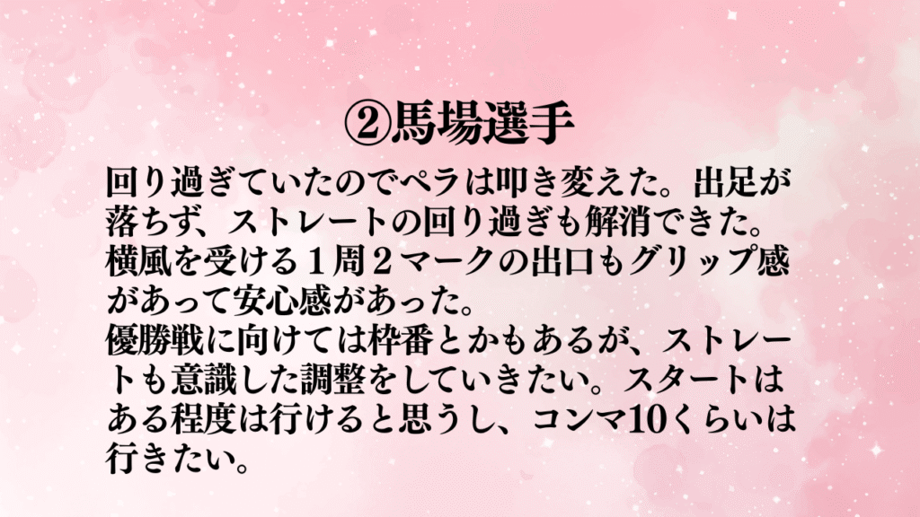 展開としては、②馬場が③峰に捲り差しをさせない展開。