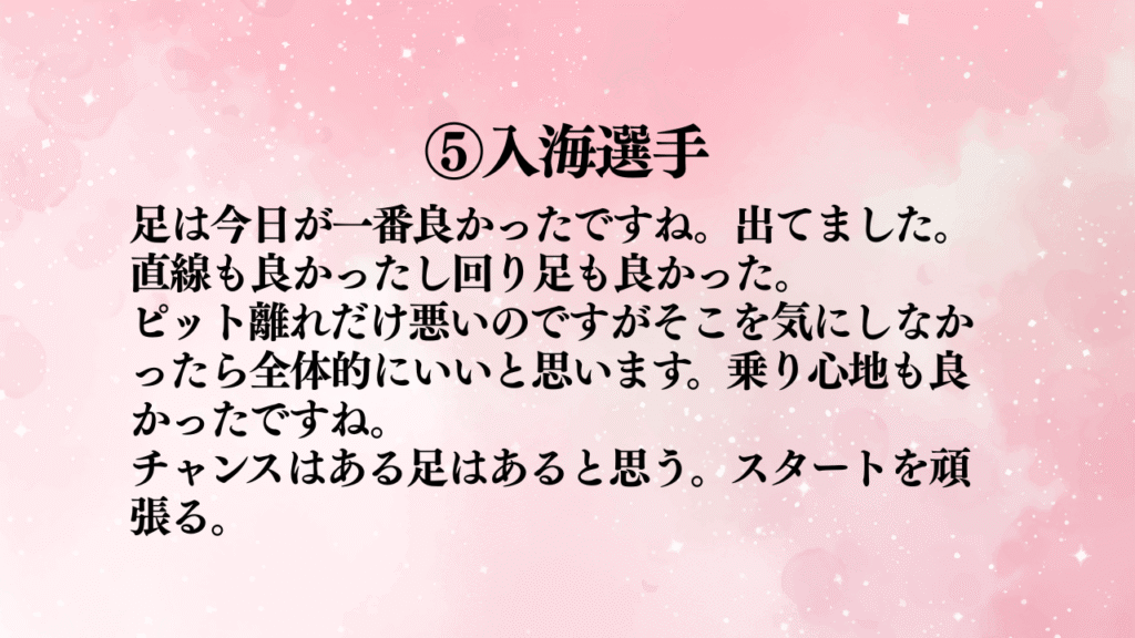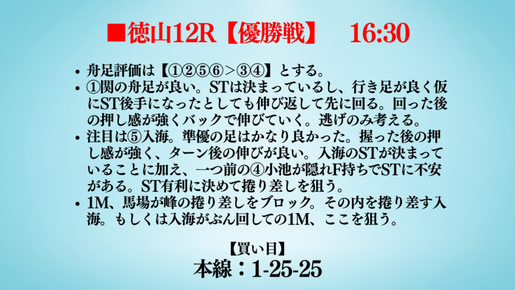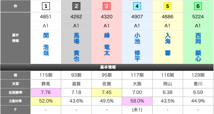 注目は⑤入海。準優の舟足はかなり良かったし、一つ前の小池がSTでやや後手になる想定。