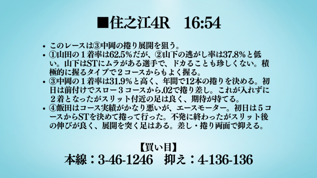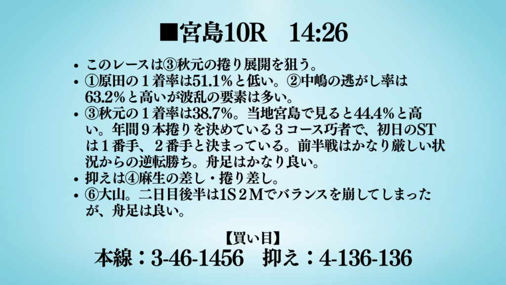 徳山G1優勝戦。完全に狙い通りの展開でしたが、馬場残せず、的中ならずでした。