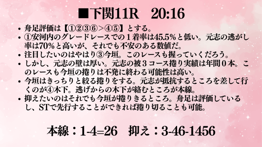 だが、今節の今垣の足は良い。早いSTを決めることができれば捲り切ることも可能と見ている。