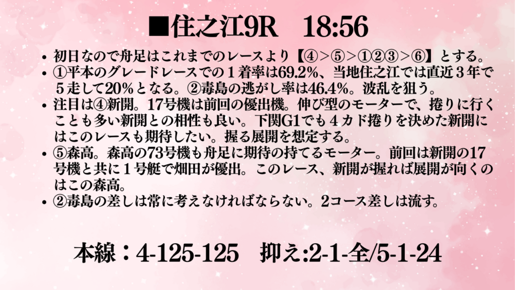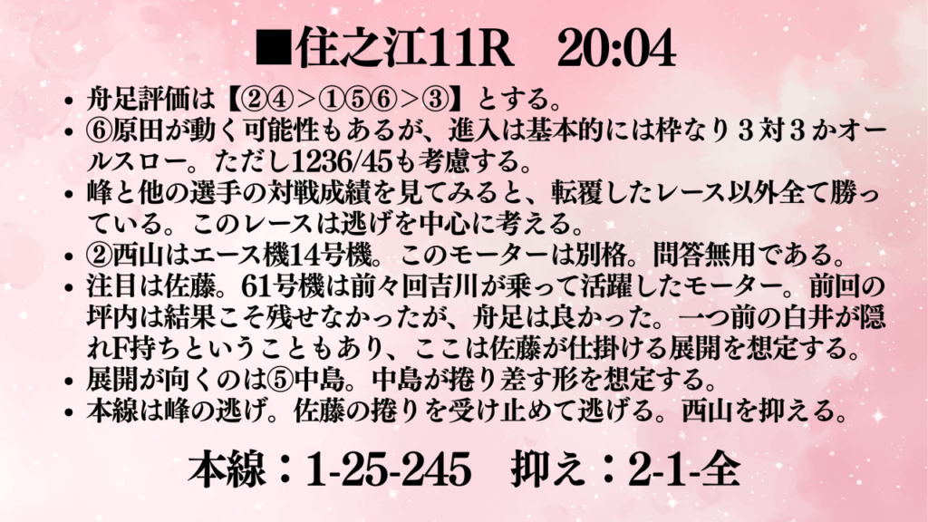 トライアル組のモーターは総じて好モーターであるし、STをしっかりと決めることができれば先に回って逃げていくだろう。