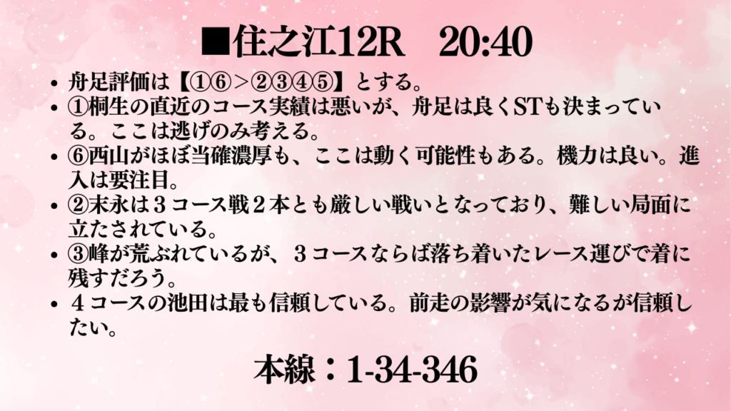 ④池田。前走のダメージが気になるが、4コースの池田は信頼している。