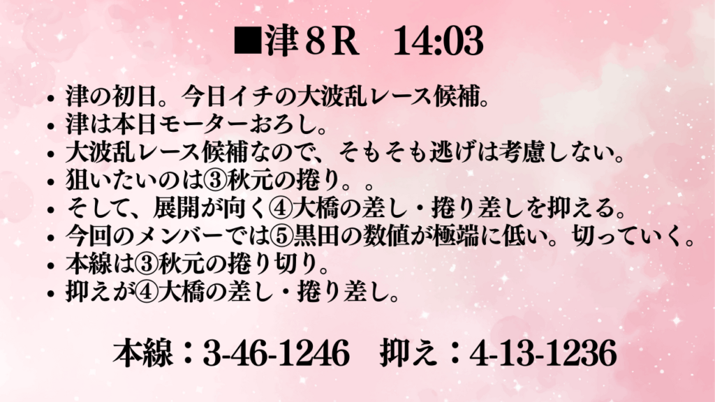 この津の8Rは、この条件下において最も波乱要素が大きいレースとなっています。