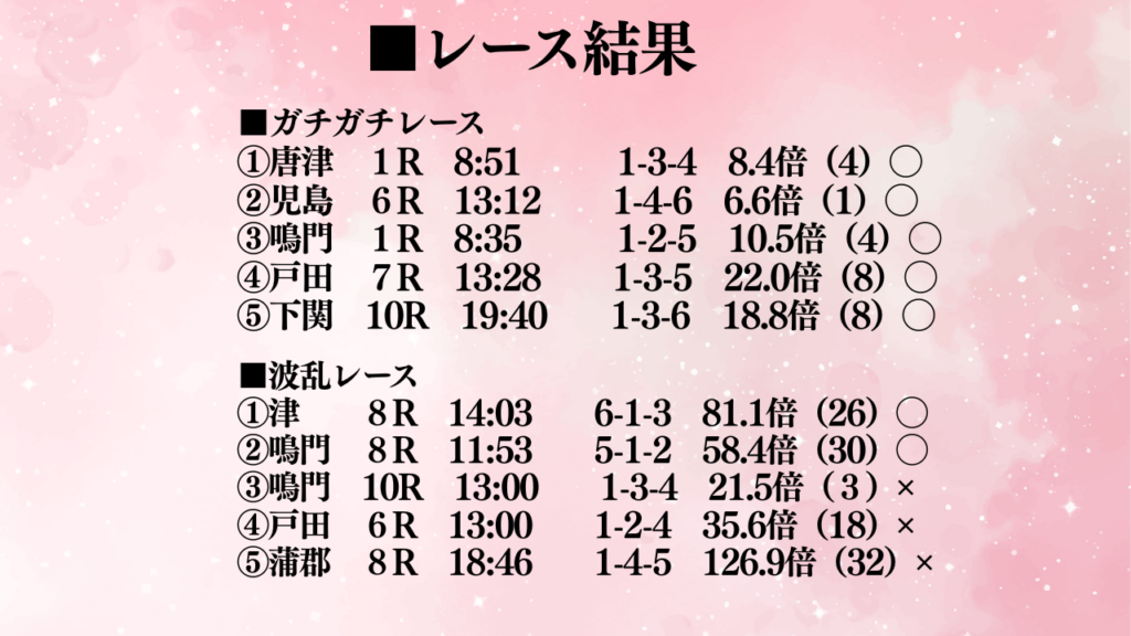 5本提示させていただいたわけなんだが、これ全部イン逃げゴリゴリ決着になるようであれば、それはもうガチガチレース検索がガチガチに機能しているということになりうるね。