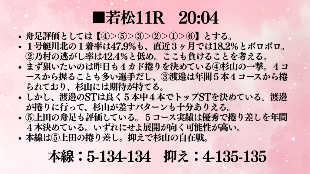 ③渡邉、④杉山いずれかが握る展開を想定する。