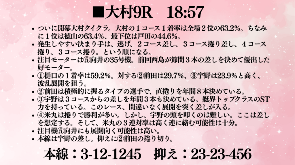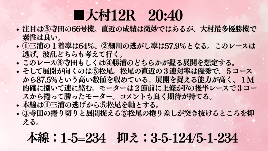このレースは③寺田、④勝浦と並んでおり、どちらかが握る展開になるだろう。