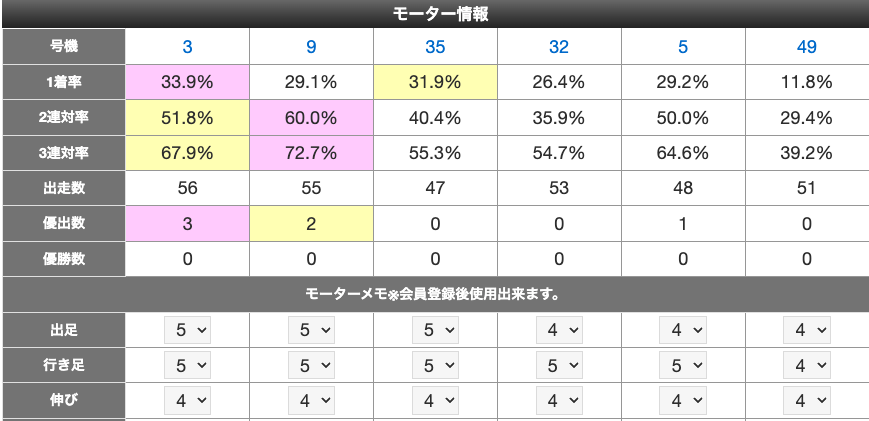 会員登録すると、モーター評価値やメモ・選手メモを残せるようになります。