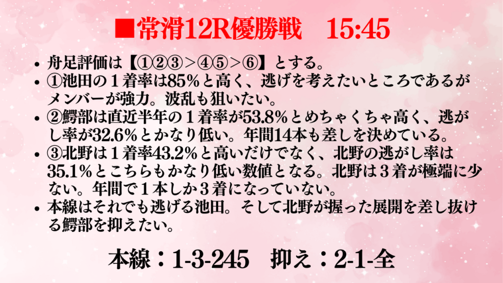 ということで、今回は常滑の優勝戦を予想しました!