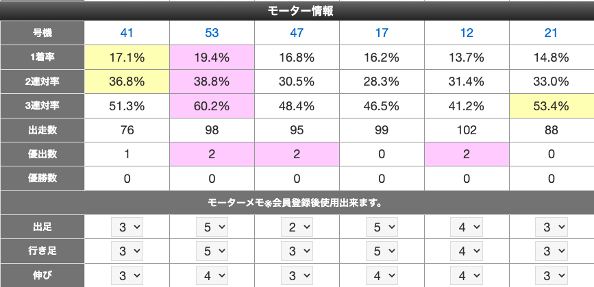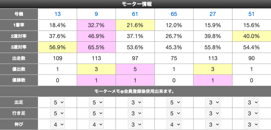 会員登録すると、モーター評価値やメモ・選手メモを残せるようになります。