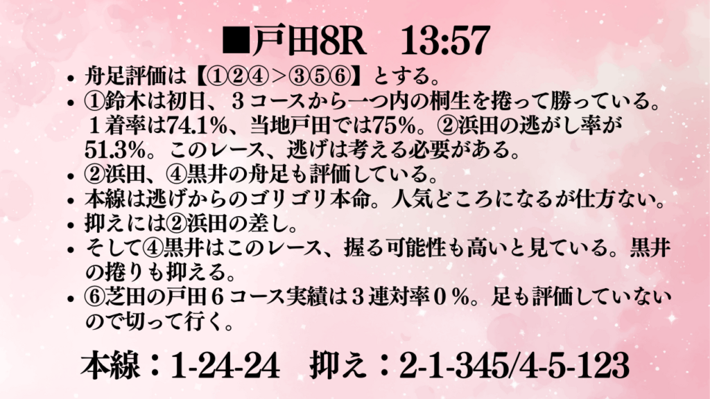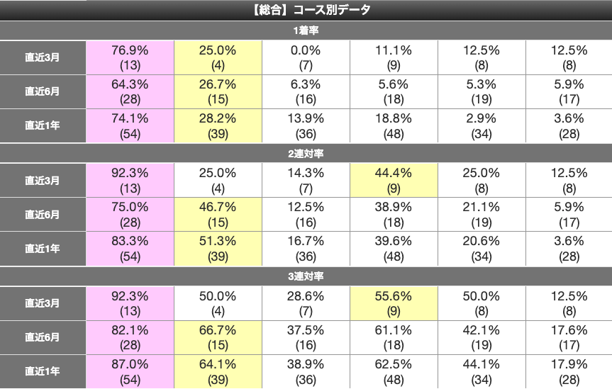①鈴木のコース実績は74.1%、当地戸田では75%と安定した数値を残している。