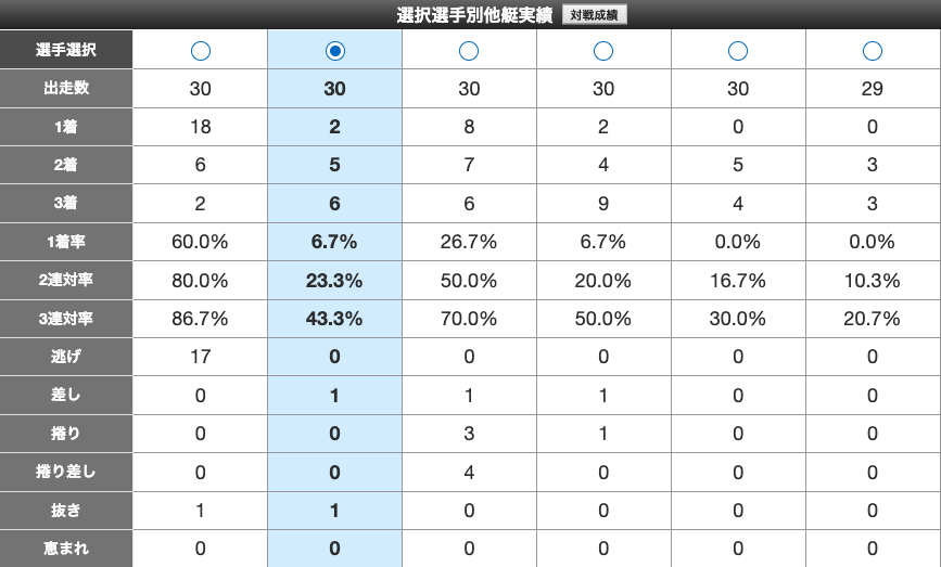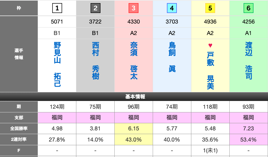 ①野見山の1着率は57.1%。当地福岡で見ても53.8%と高いとは言えない数値。