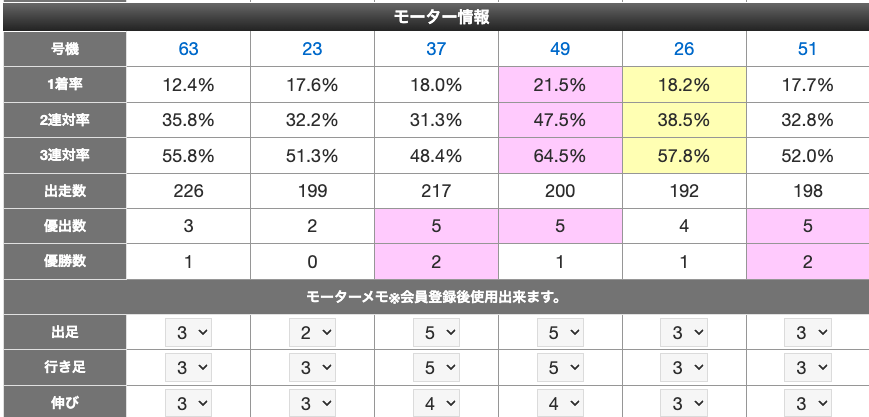会員登録すると、モーター評価値やメモ・選手メモを残せるようになります。