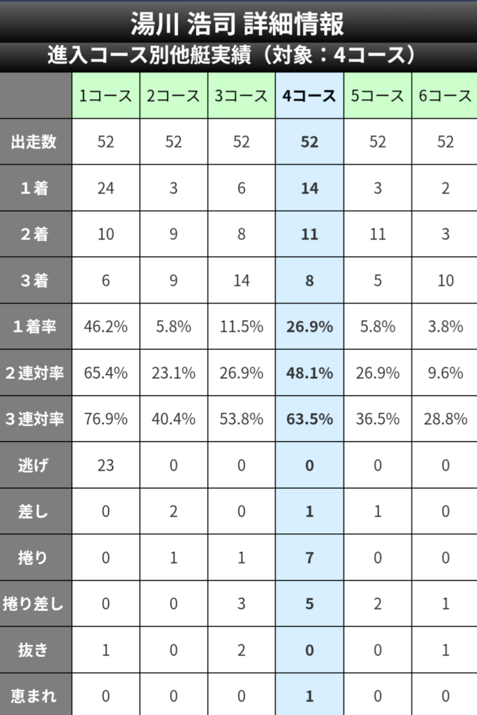③藤原選手の3コース時のデータとして4コースの選手からの【捲り】を許したのは、0。