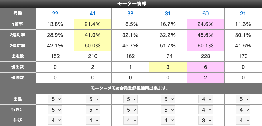 会員登録すると、モーター評価値やメモ・選手メモを残せるようになります。