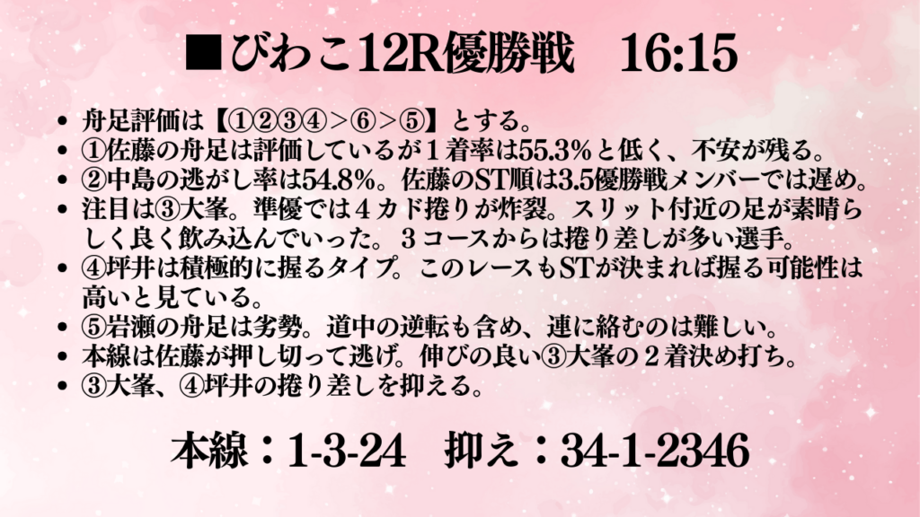中島の差しよりも、大峯・坪井の直近の活躍ぶりを重視する。