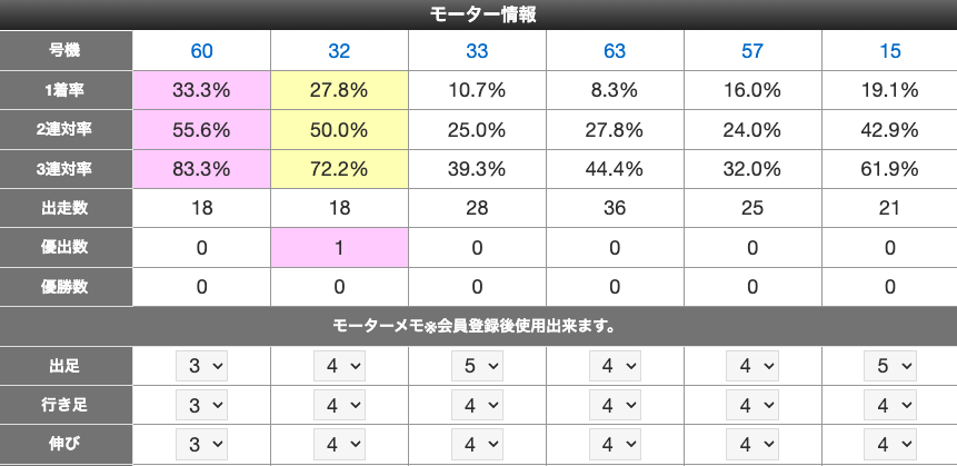 会員登録すると、モーター評価値やメモ・選手メモを残せるようになります。