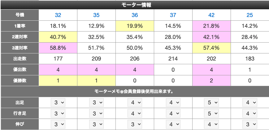 会員登録すると、モーター評価値やメモ・選手メモを残せるようになります。