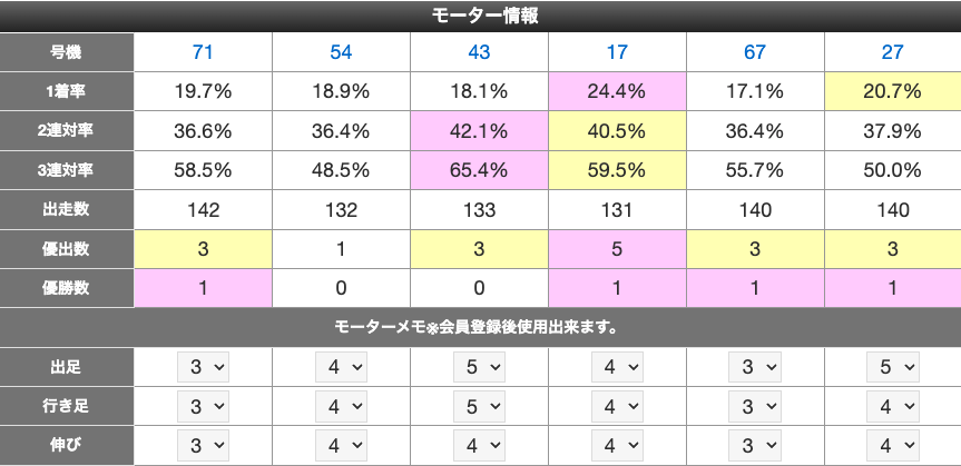 会員登録すると、モーター評価値やメモ・選手メモを残せるようになります。