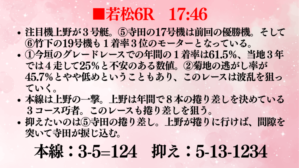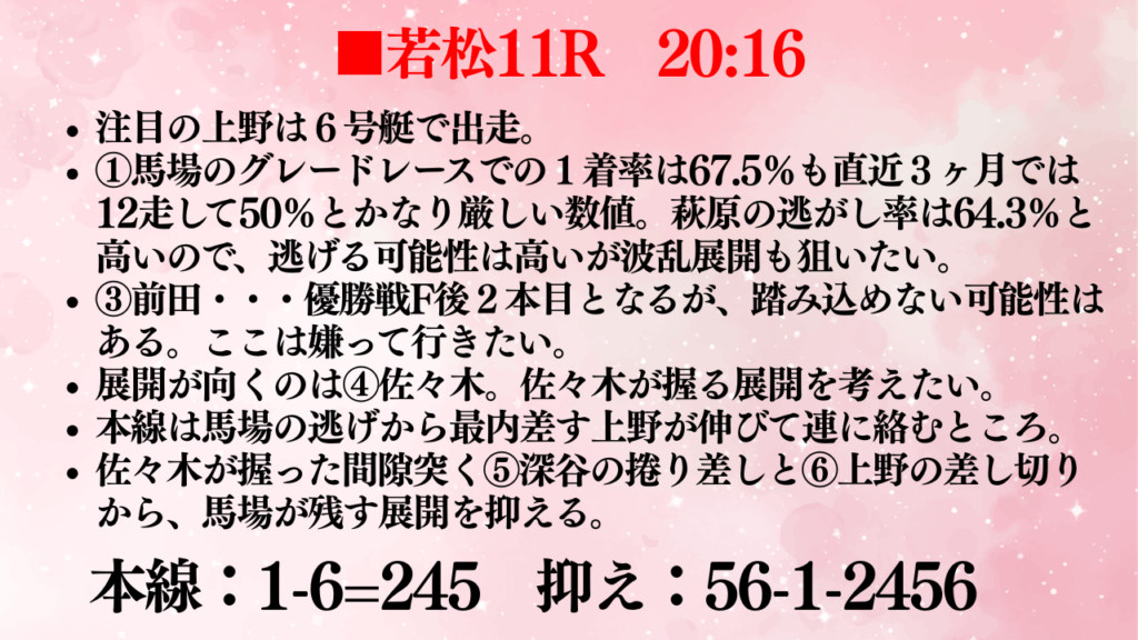 ②萩原の逃がし率は高く、その点は好材料だが負けることも考えたい。