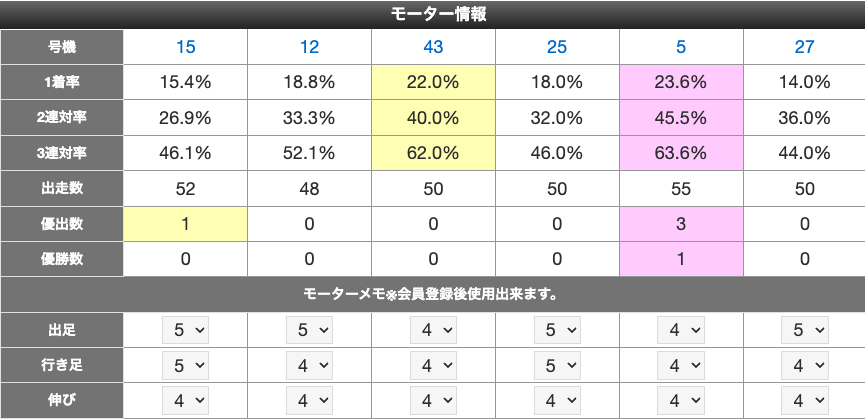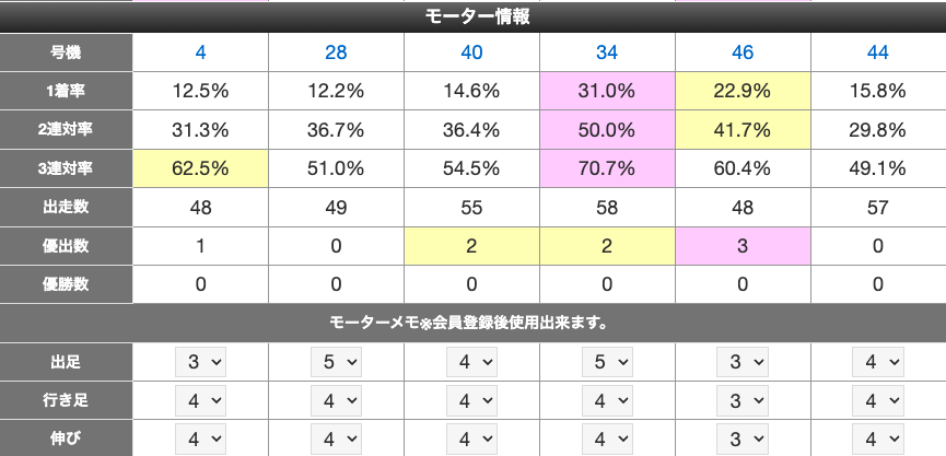 会員登録すると、モーター評価値やメモ・選手メモを残せるようになります。
