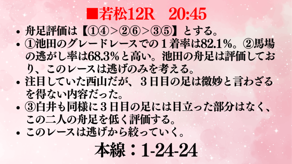 このレースは、濱野谷と元志のSTが遅れる可能性も高いと見ている。
