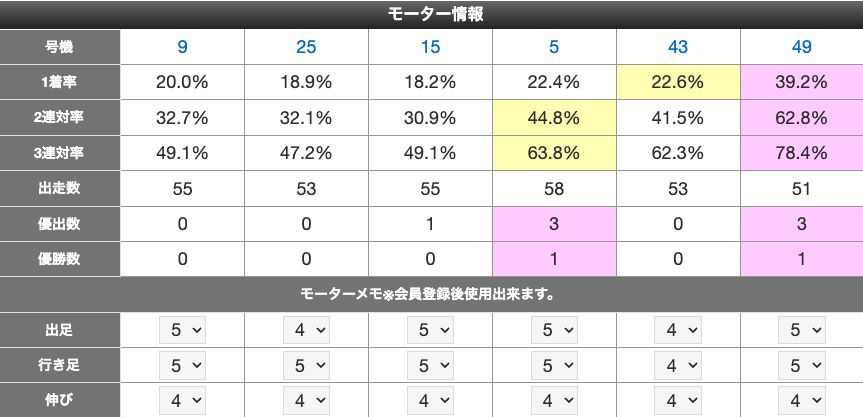会員登録すると、モーター評価値やメモ・選手メモを残せるようになります。