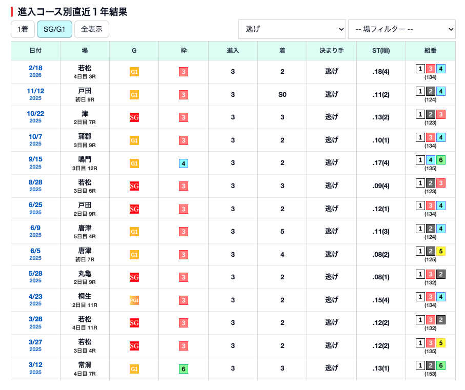 SG・G1戦でかつ逃げ決着となったレースでフィルタしたものになります。