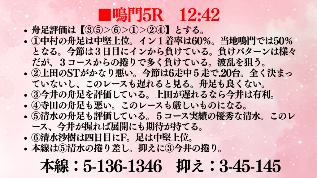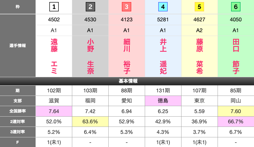 小野の2着から、鳴門との相性の良い田口を3着に絡めた舟券を本線とする。