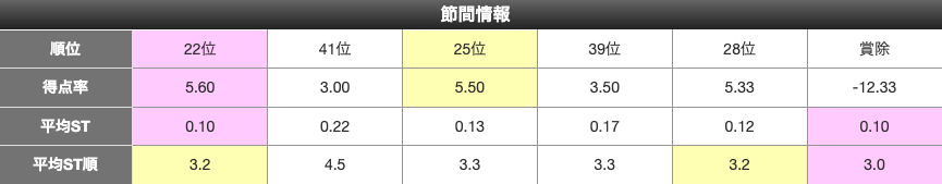 今節ここまでの平均ST.22。平均ST順が4.5である。