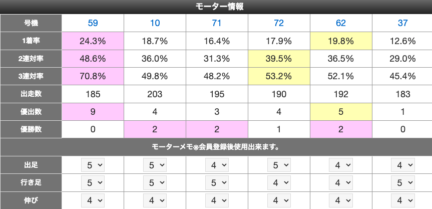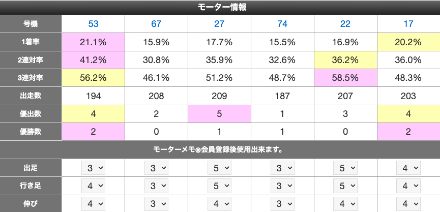 会員登録すると、モーター評価値やメモ・選手メモを残せるようになります。