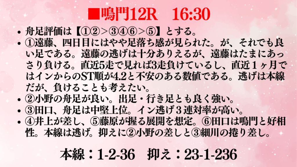 小野の2着から、鳴門との相性の良い田口を3着に絡めた舟券を本線とする。
