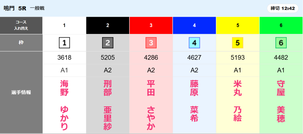 ってことで今日は、鳴門5R 12:42〆のレースを予想していきたいと思います。