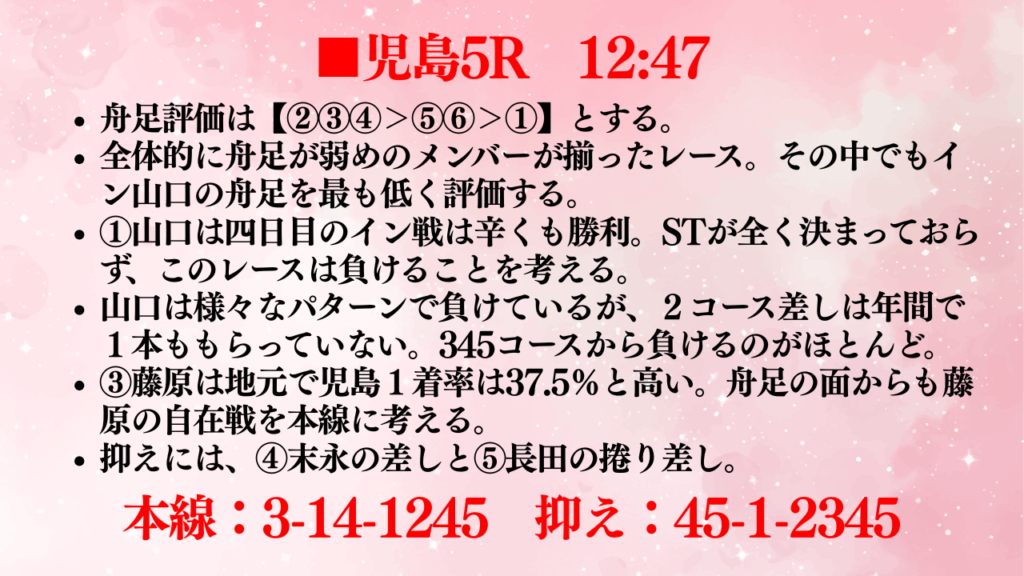 今回は児島の準優日ですが、5Rを予想していきます。
