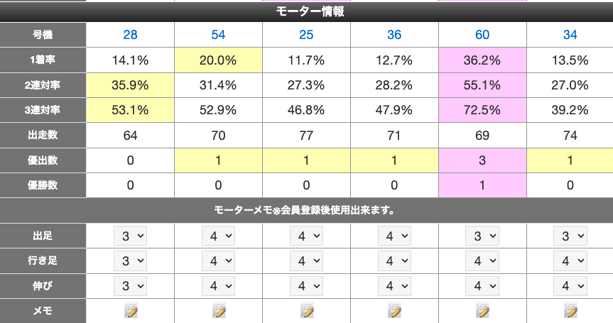 会員登録すると、モーター評価値やメモ・選手メモを残せるようになります。