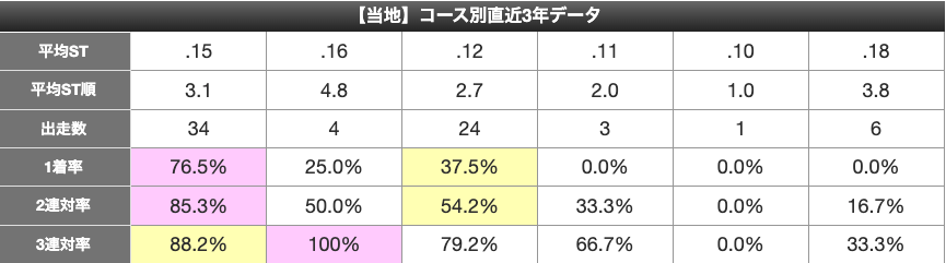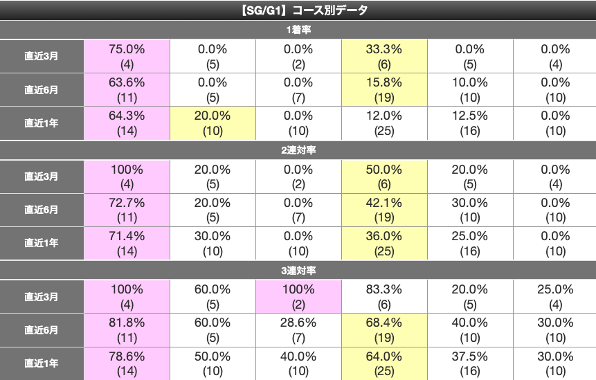 山口の負けのほとんどは3,4,5コースからとなっている。
