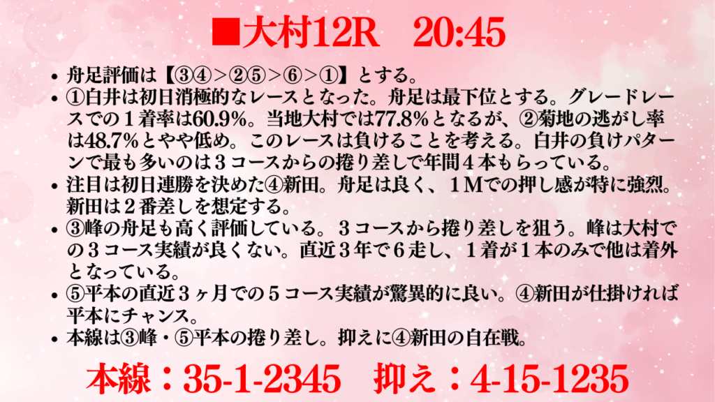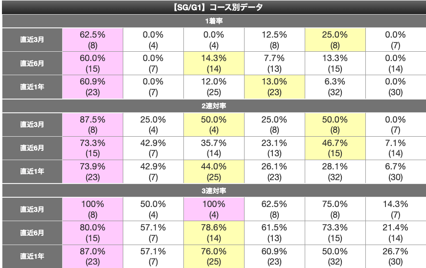 峰は大村全体で見るとかなり良い数値を残しているが、大村3コースに限っては数値が良くない。
