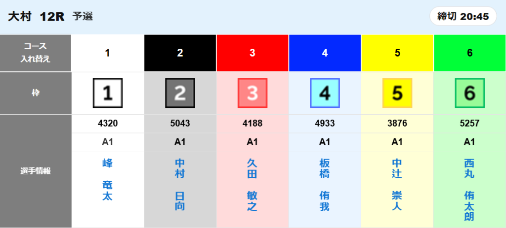 今日は、大村12R 20時45分締切のレースを予想していきます。