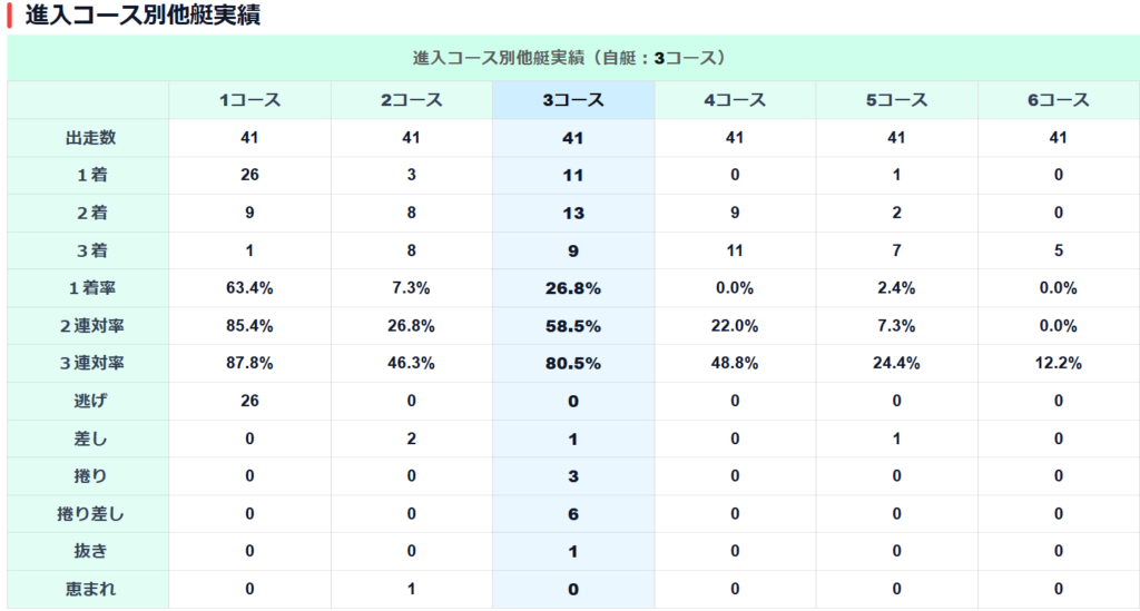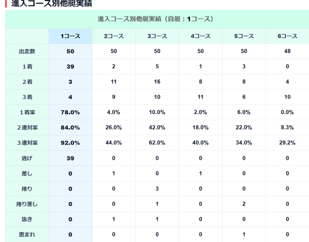 峰選手の1コース戦の特徴として、2コースの1着率が非常に低い。