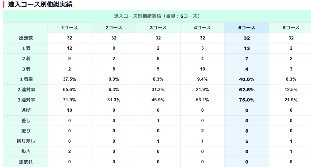 5コース勝率は40%、捲り8本・捲り差し5本。